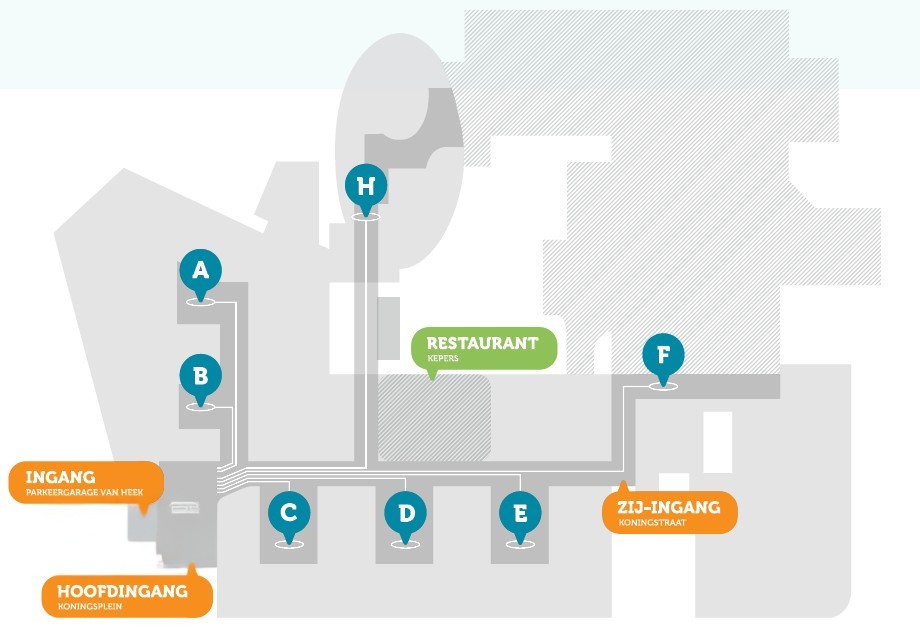 Uitleg bij de plattegrond: In je afspraakbrief staat de route naar jouw afdeling. Bijvoorbeeld: D15.