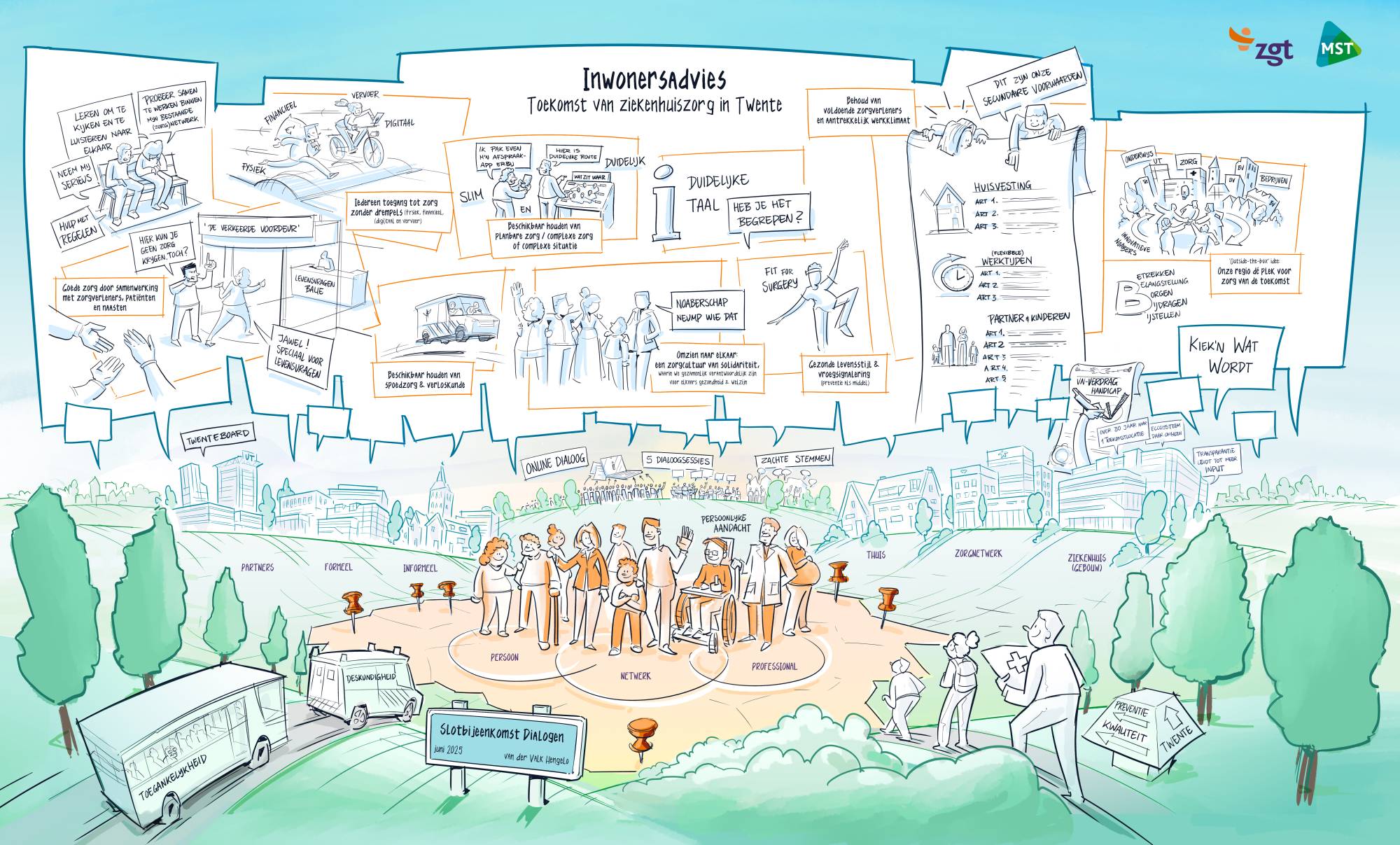 MST en ZGT organiseerden ook bijeenkomsten waarin we inwoners van Twente vroegen om mee te denken over oplossingen voor de ziekenhuiszorg in Twente. Er deden 75 mensen uit heel Twente mee.