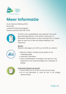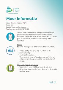 Op de Acute Opname Afdeling worden 24 uur per dag patiënten voor diverse specialismen opgenomen en ontslagen. U zult merken dat het verloop van patiënten op de afdeling groot is. Mogelijk veroorzaakt dit overlast voor u. Wij vragen hiervoor uw begrip.